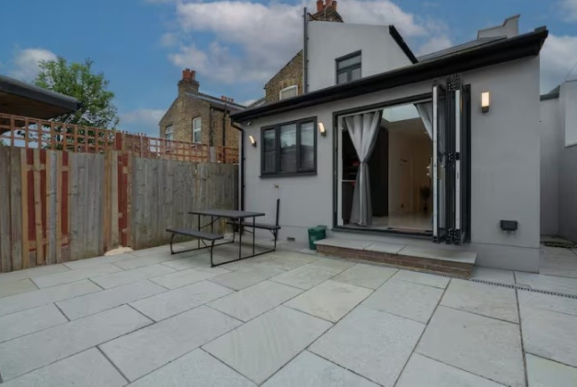 🗝 High ceilings, skylights & bifold doors opening onto a private enclosed garden with picnic table
