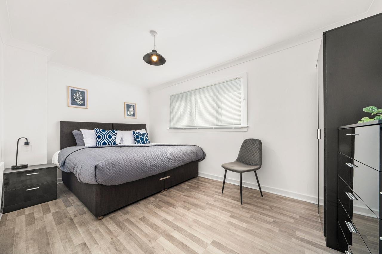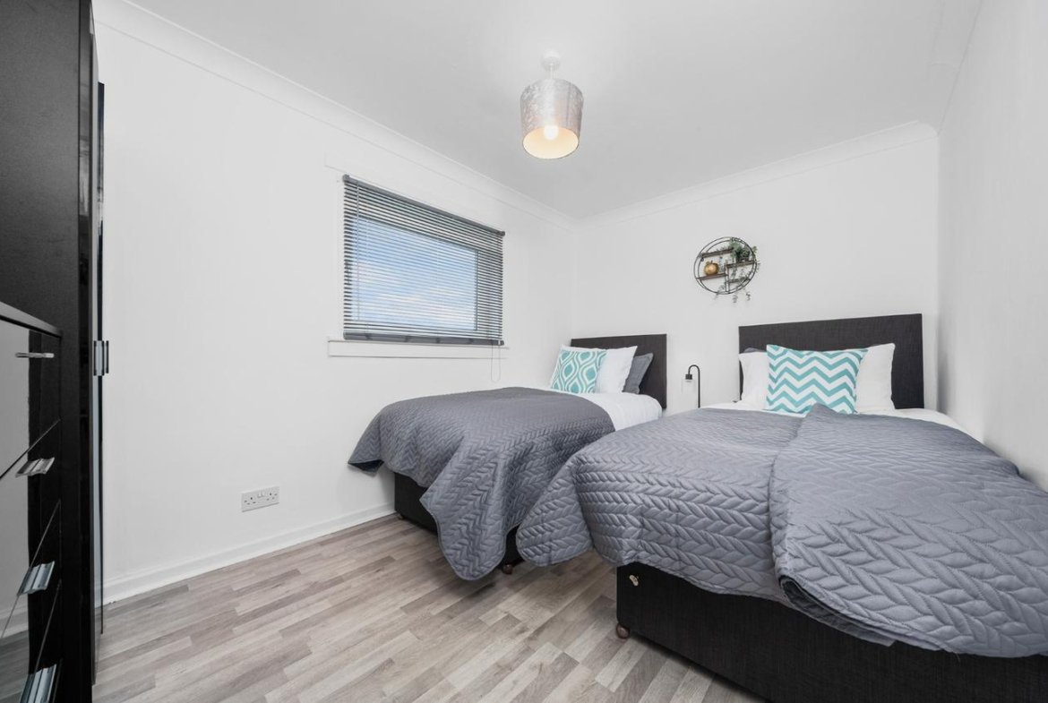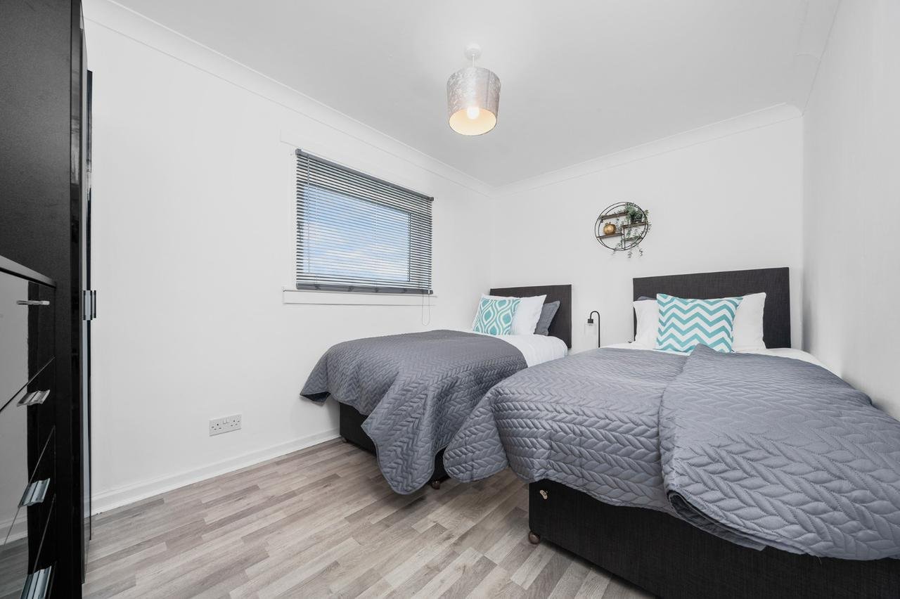 Recently refurbished 3 bedroom first floor apartment located in Shawhead area of Coatbirdge with free on street parking. Situated over 2 levels this property offers 3 bedrooms with zip link beds which can be set up as 3 super king size beds perfect for couples or 6 single beds ideal for contractors. There is also a wardrobe with full length mirror and chest of drawers in each room. The Living room offers comfy sofas, smart TV with Netflix and dining table which can be turned in to pool table.. Kitchen offers fridge & freezer, microwave, oven with hob, washing machine and dishwassher. Spacious bathroom offers shower over bath and complimentary toiletries. All the bed linen and towels are included as well.