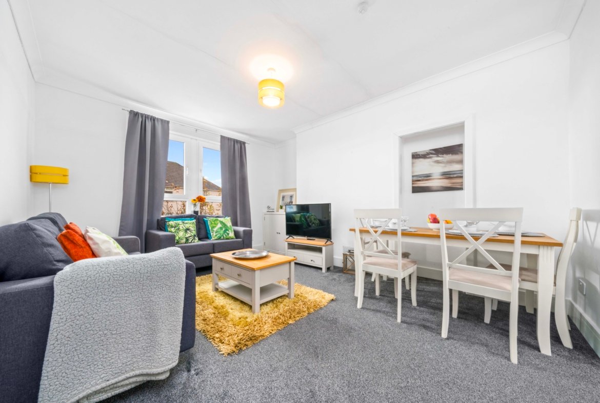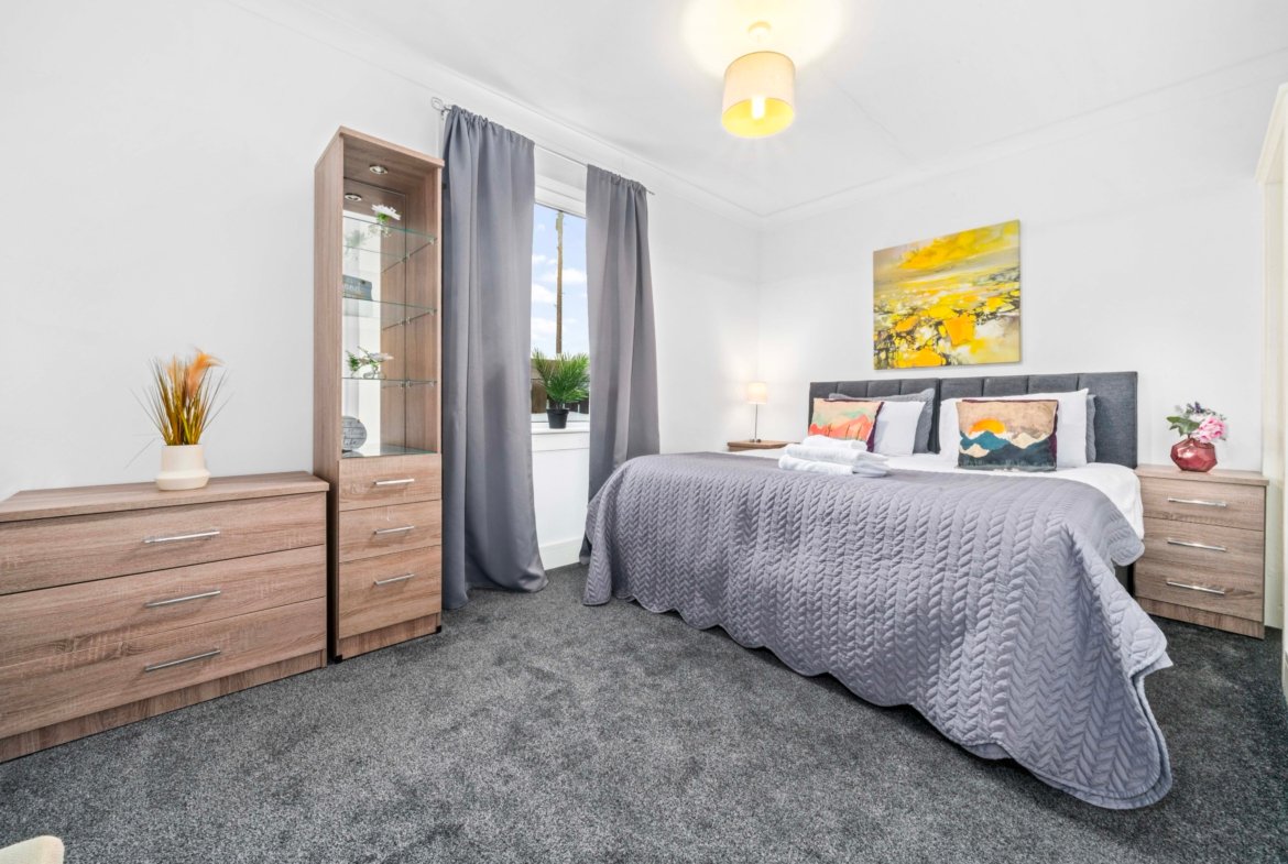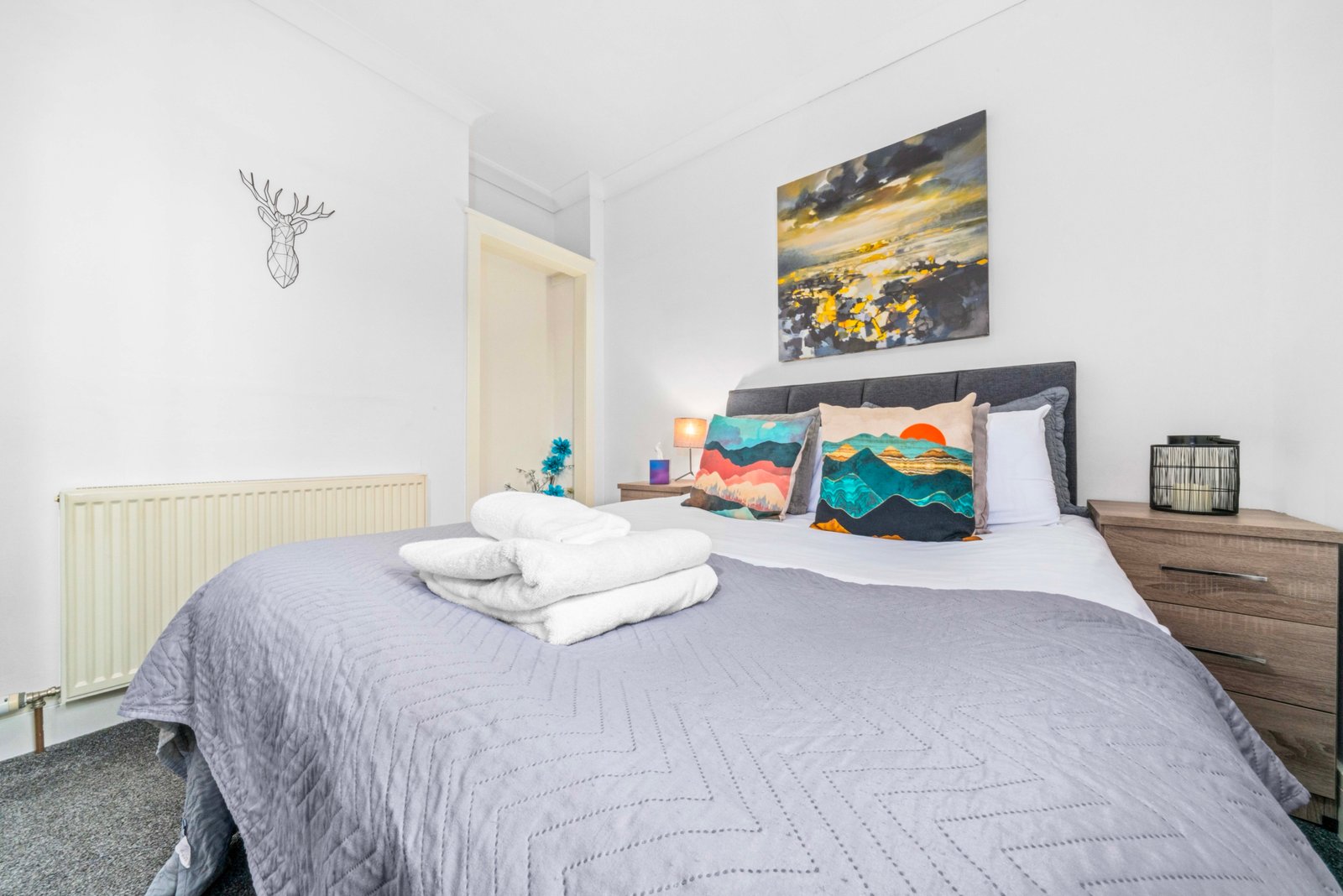 Traditional ground floor 2 bedroom apartment located in Airdrie with free on street parking. Two spacious bedrooms offer super king zip link in one room and king size bed in other. There is also a wardrobe with full length mirror. The Living room offers , smart TV with Netflix and dining table. Kitchen offers fridge freezer, microwave, oven with hob and washing machine. Modern bathroom offers shower over bath and complimentary toiletries. You can also use back garden area if you wish. All the bed linen and towels are included as well.