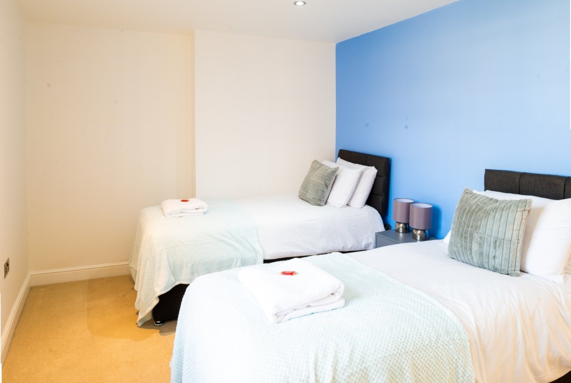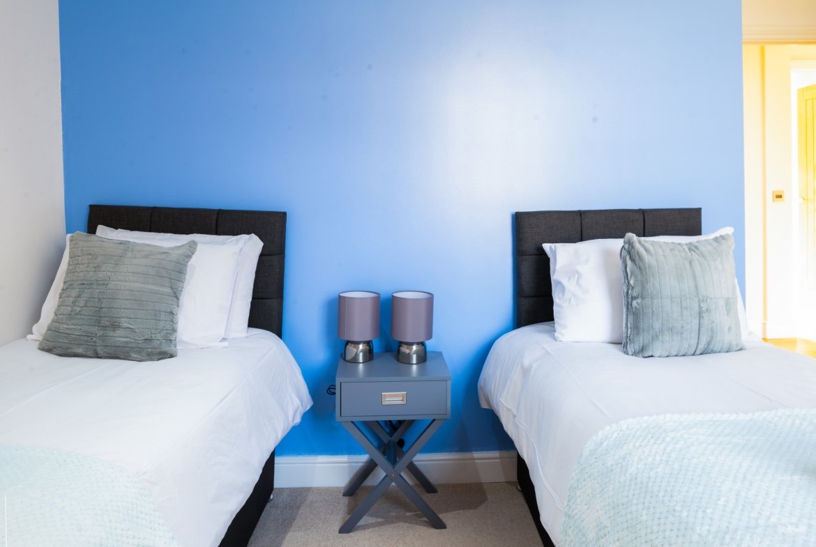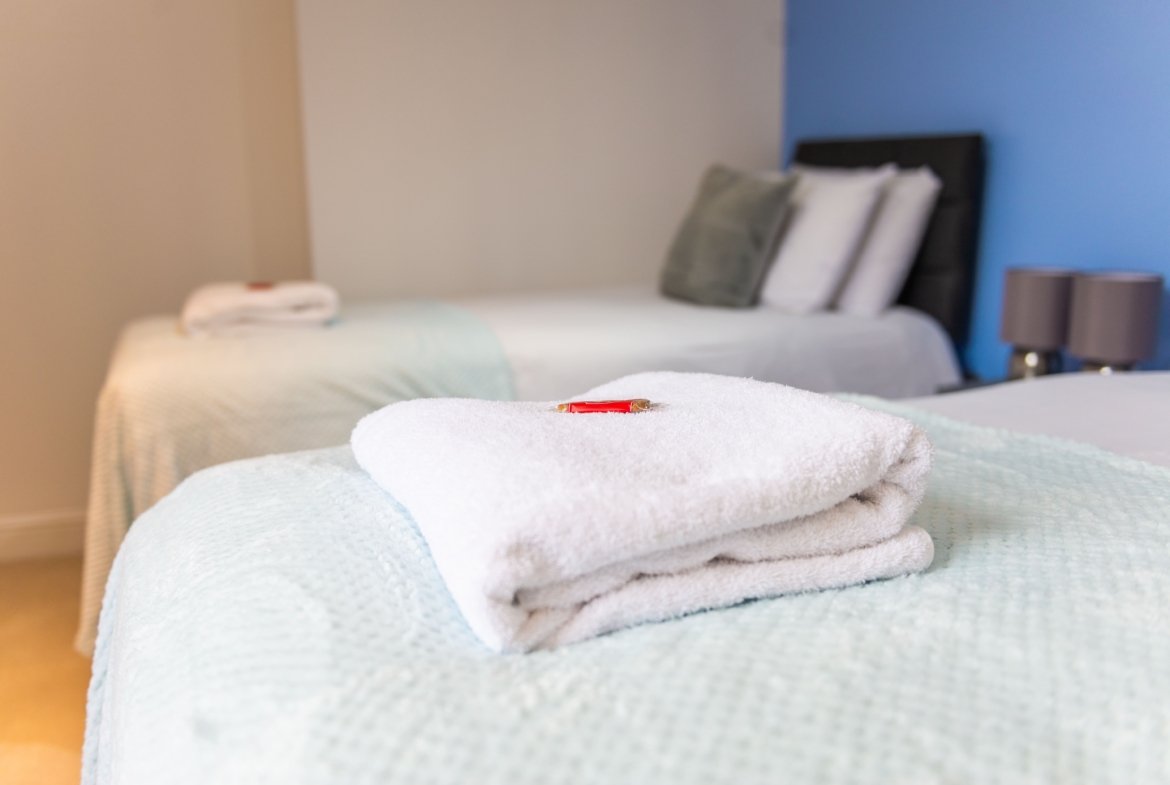 ◼︎Features include two single beds in the first bedroom, two double beds in the second bedroom, and a full sofa bed in the living area.