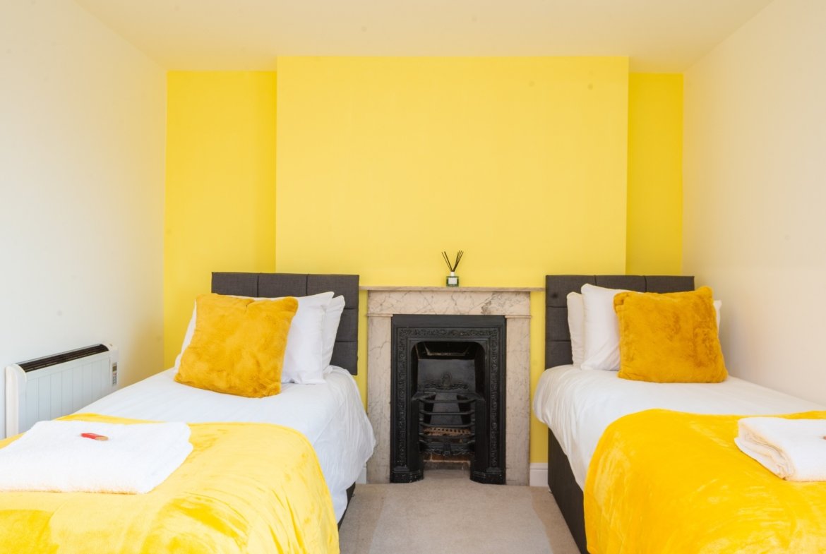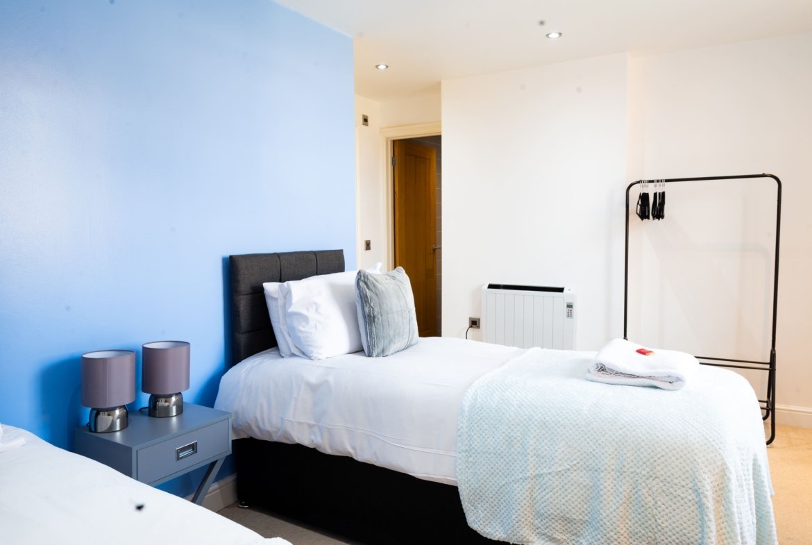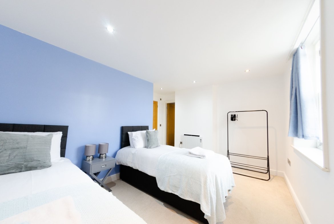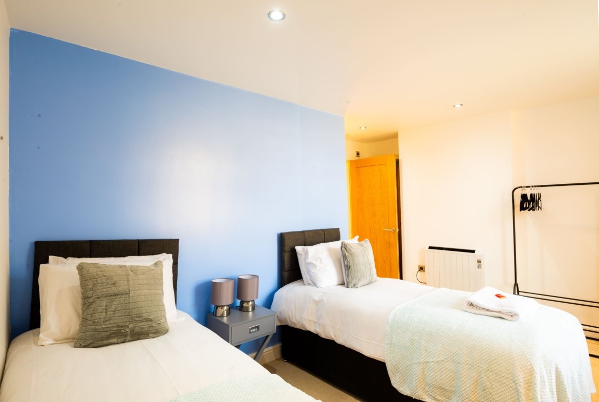◼︎Features include two single beds in the first bedroom, two double beds in the second bedroom, and a full sofa bed in the living area.