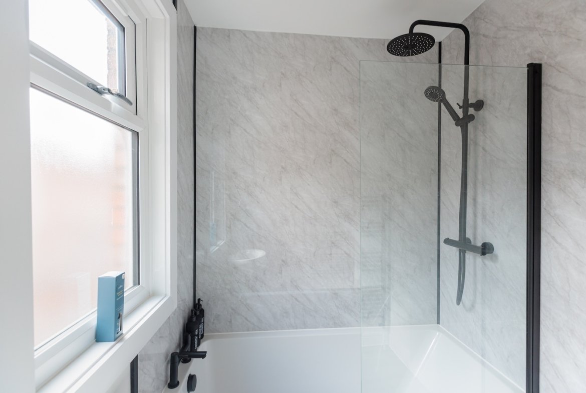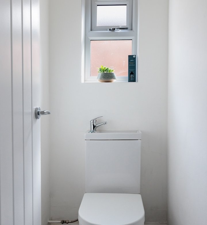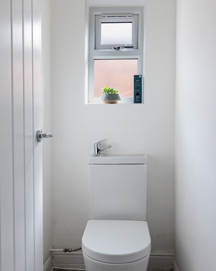 After a day of exploring, you’ll sleep soundly in comfortable beds prepared with fresh linens. The house sleeps 8 guests and features a sofa bed for extra flexibility. Enjoy two modern bathrooms: one main bathroom with a bath, toilet, shower, and sleek black fixtures, and an additional toilet in a separate room for convenience.