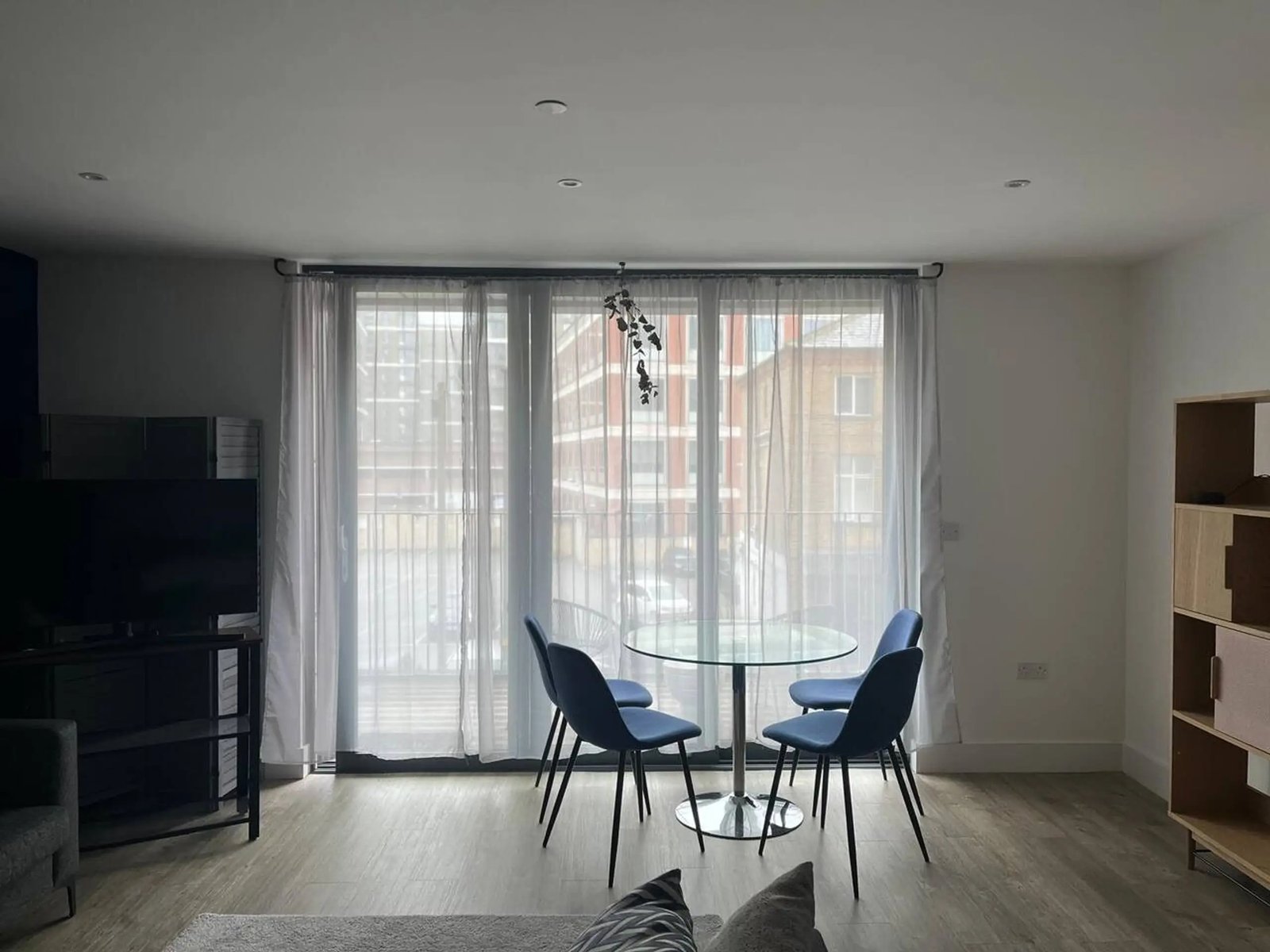 • 🛋 Modern Living & Dining Area — Comfortable sofa, dining table, TV, and access to the balcony