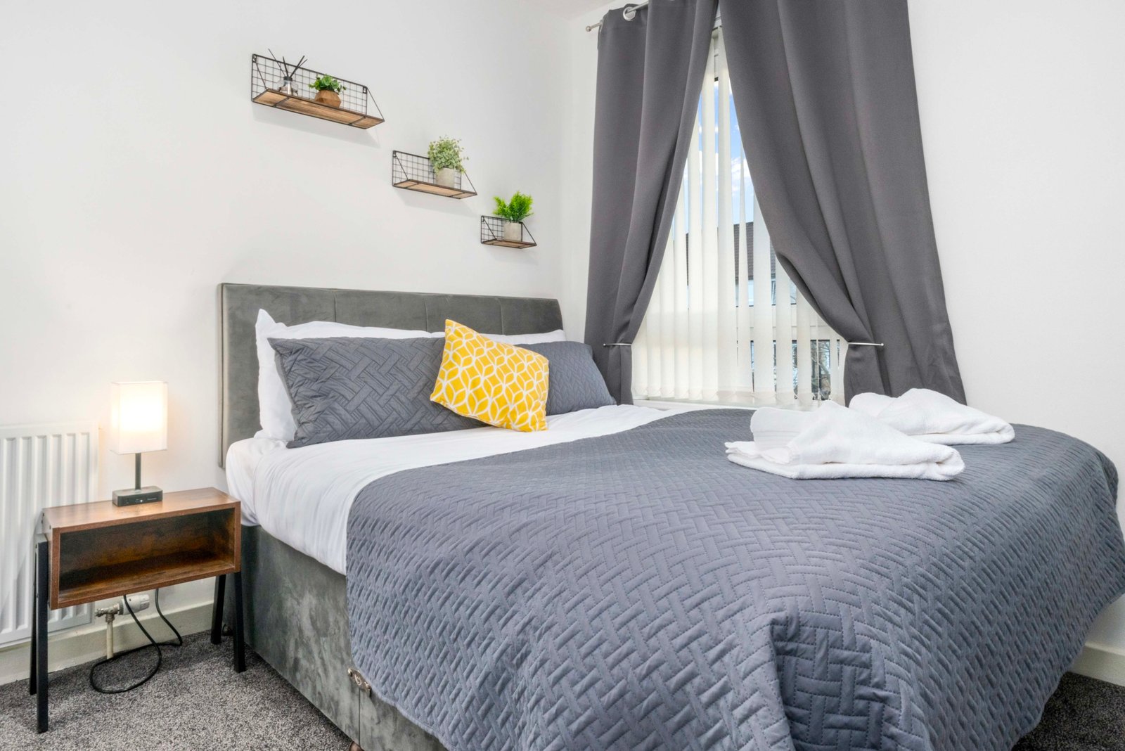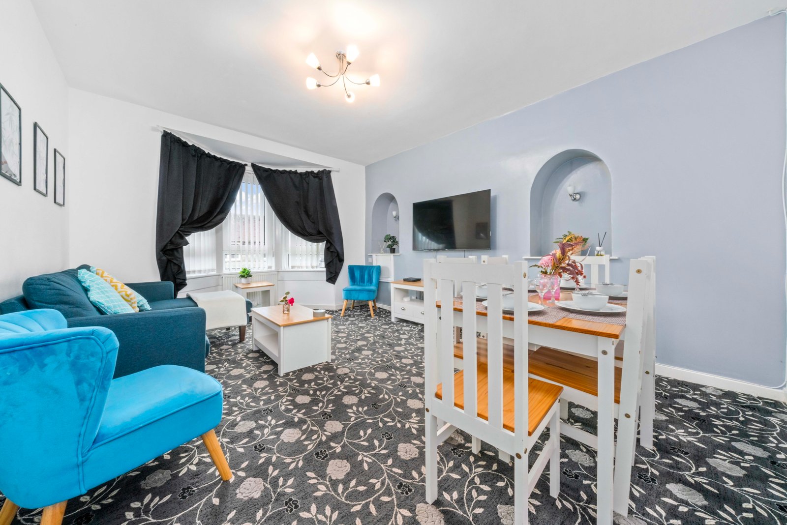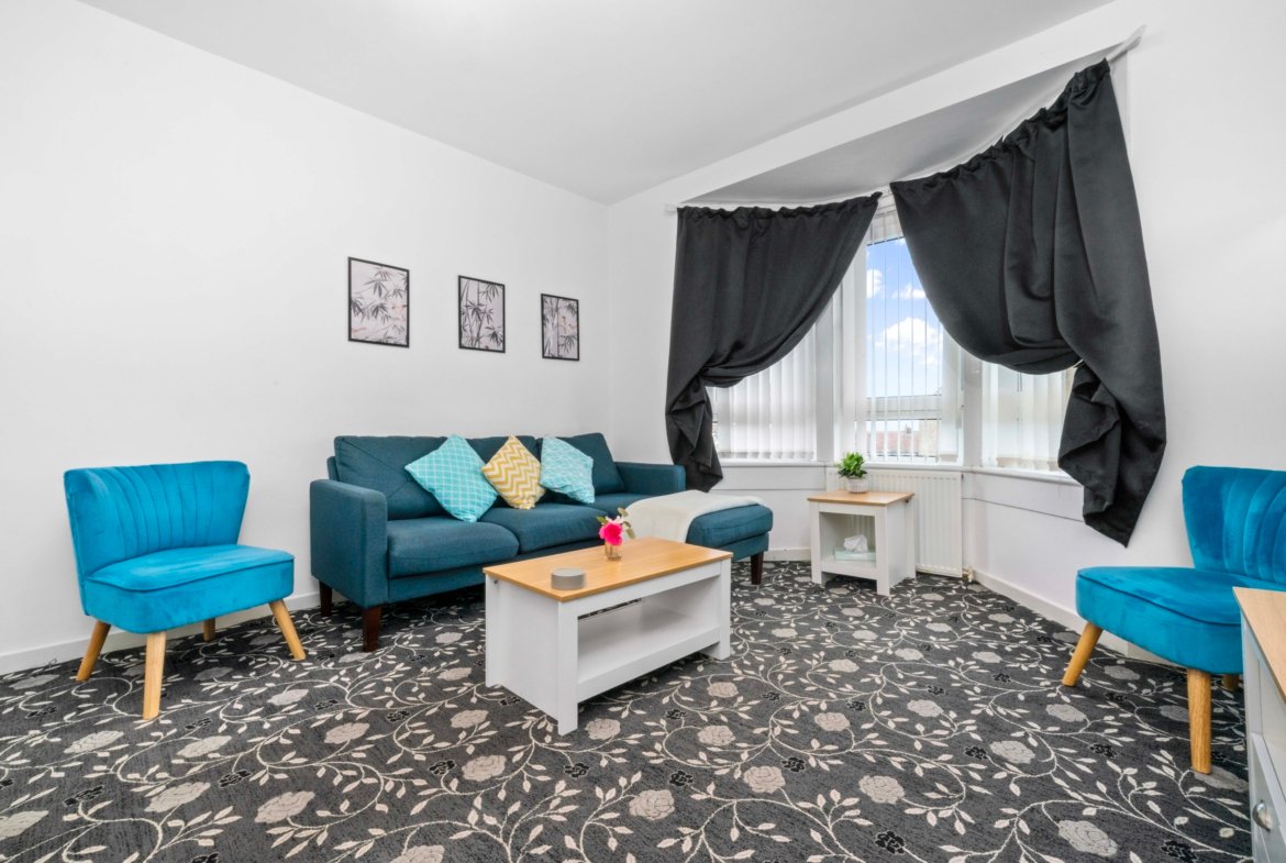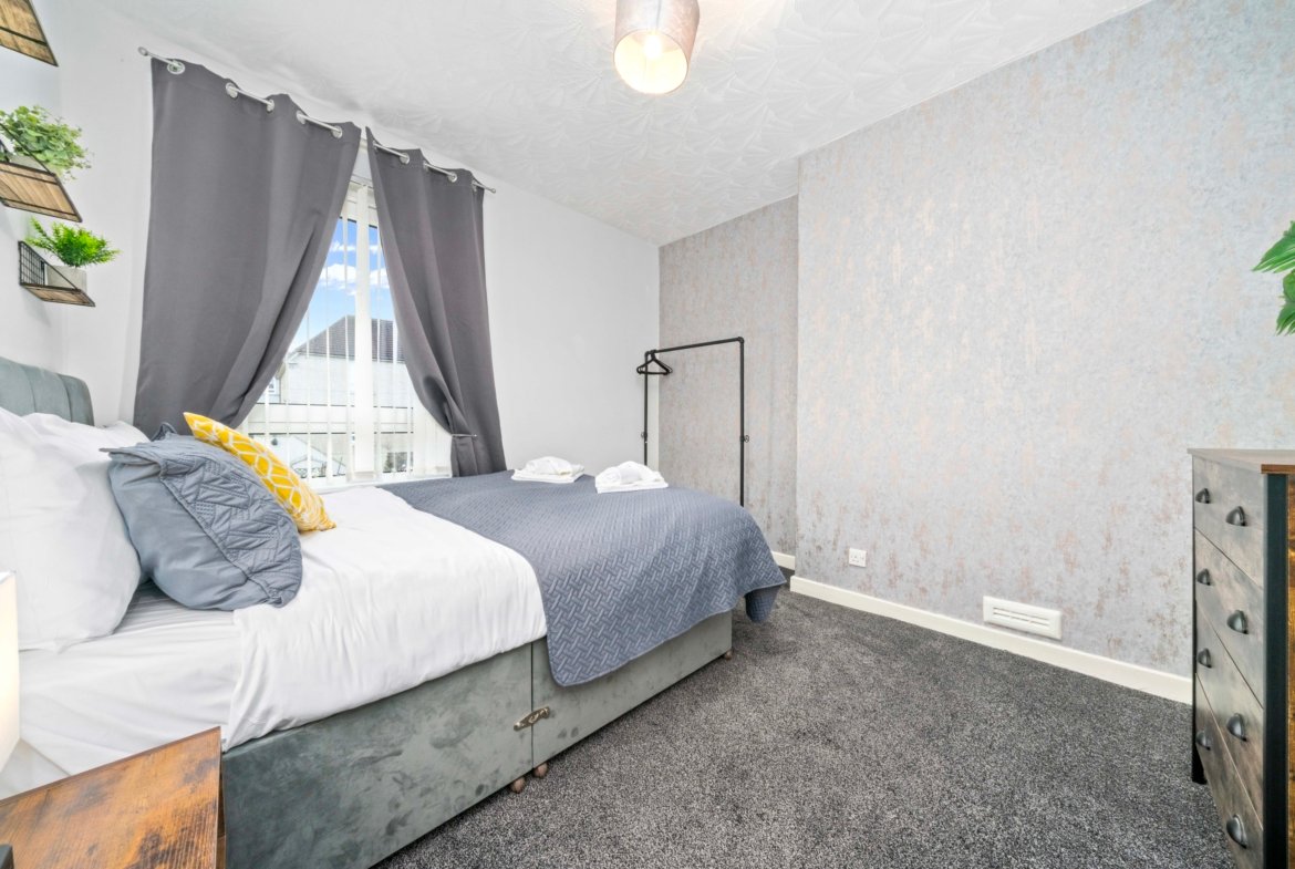 Traditional first floor 4 bedroom apartment located in Airdrie with free on street parking. Four spacious bedrooms offer super king beds in 3 bedrooms and king bed in fourth bedroom ideal for contractors and children. There is also a wardrobe with full length mirror. The Living room offers comfy bed, smart TV with Netflix and dining table. Kitchen offers fridge freezer, microwave, oven with hob and washing machine. Modern wet room offers walk in shower and complimentary toiletries. You can also use back garden area if you wish. All the bed linen and towels are included as well.