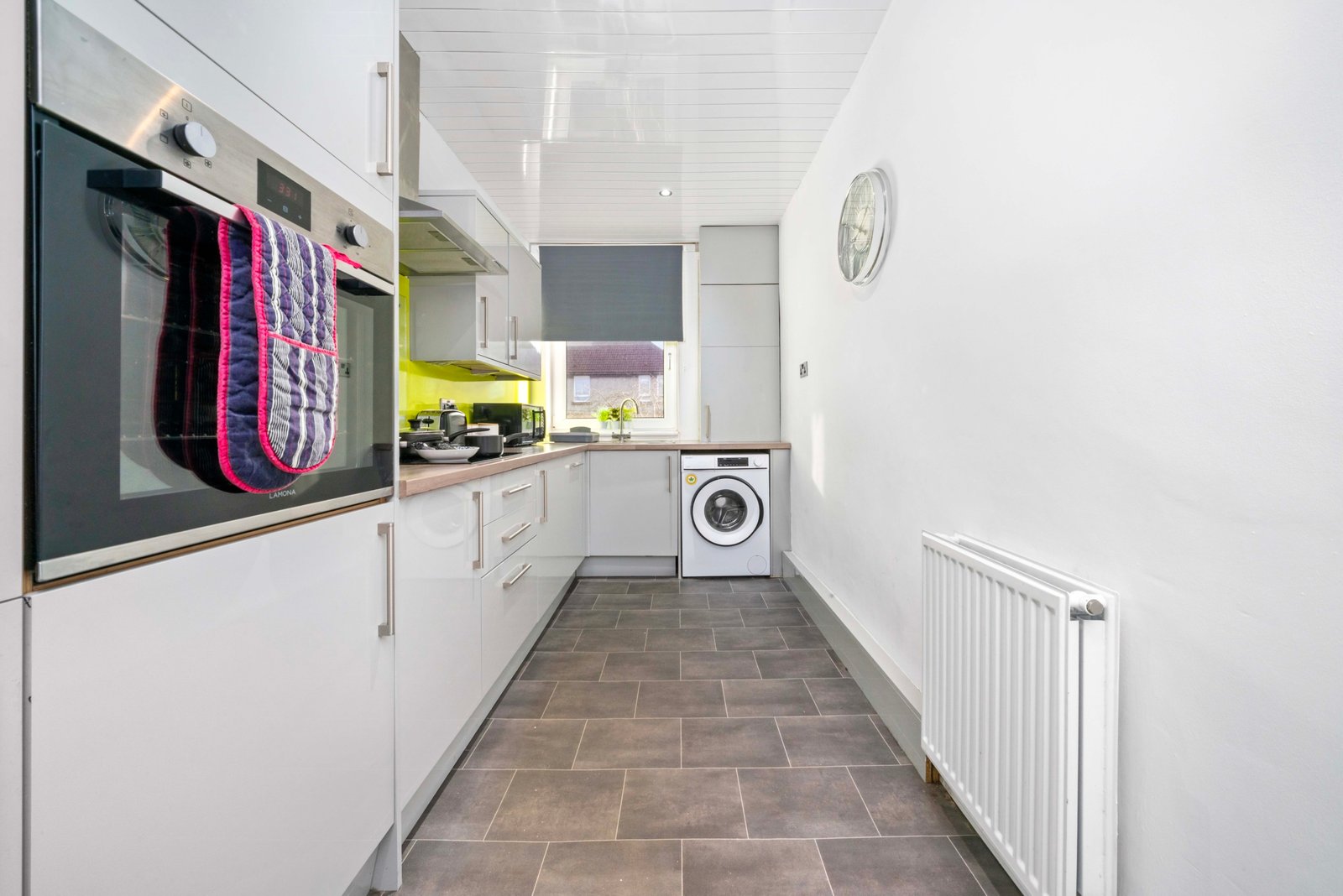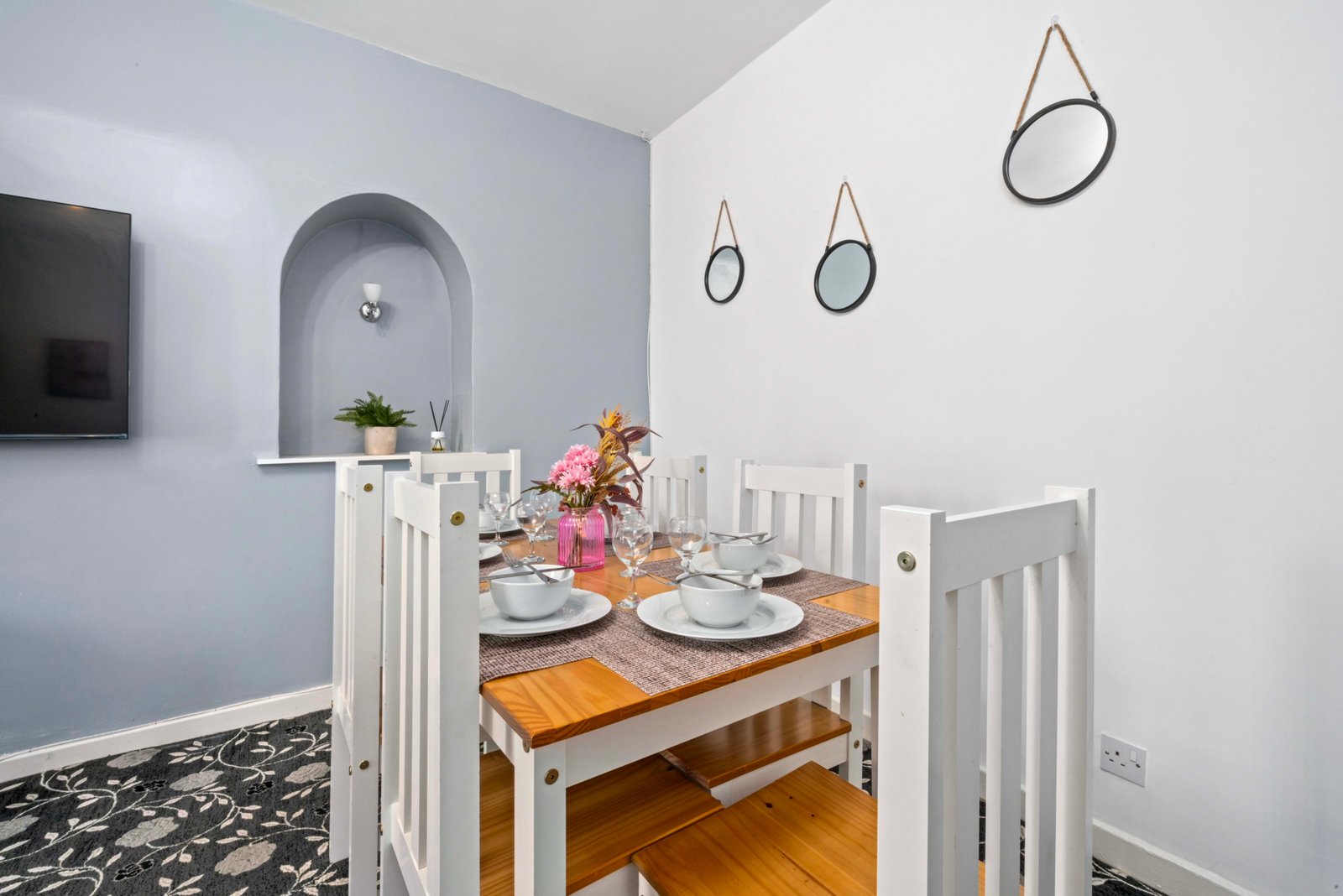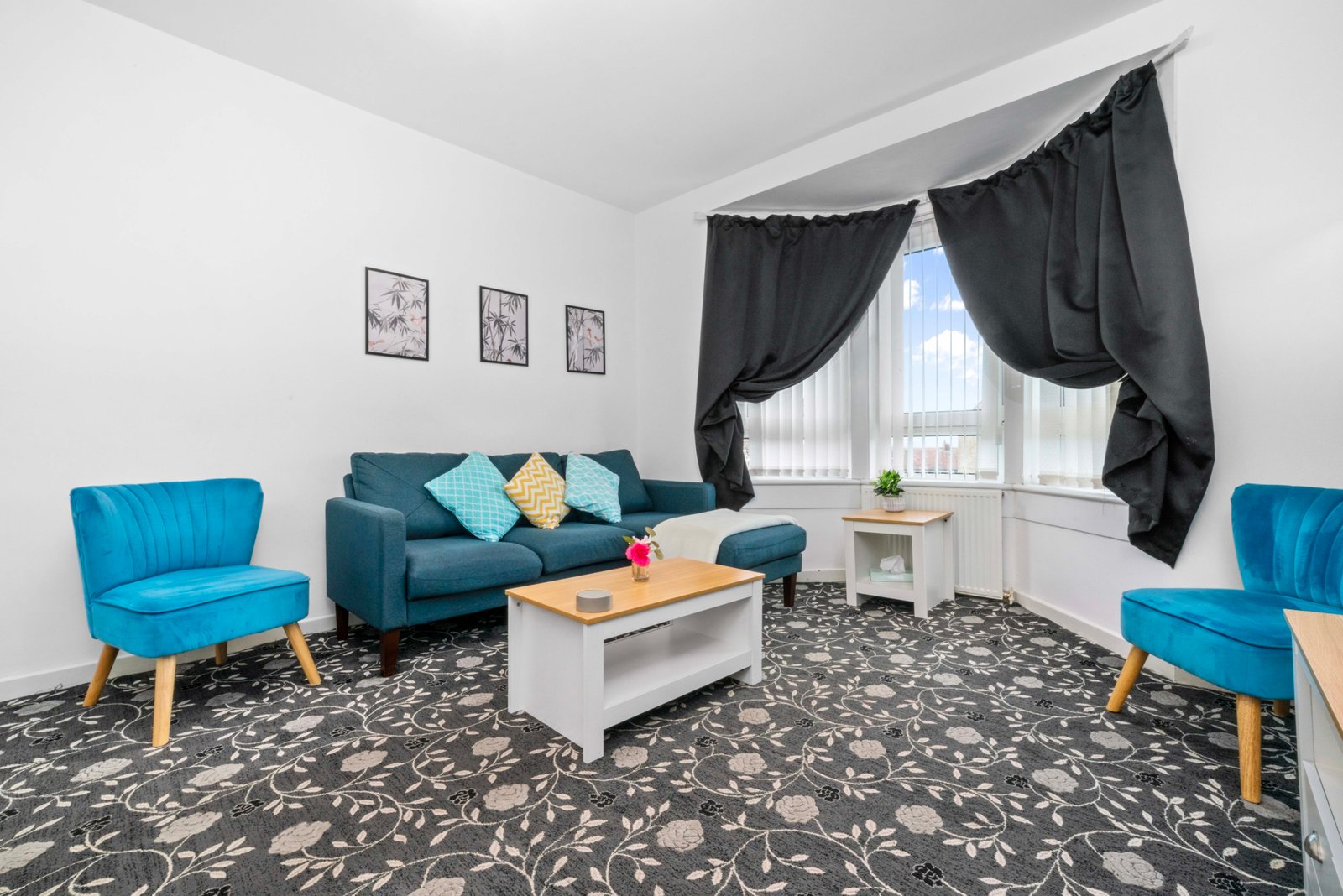 Traditional first floor 4 bedroom apartment located in Airdrie with free on street parking. Four spacious bedrooms offer super king beds in 3 bedrooms and king bed in fourth bedroom ideal for contractors and children. There is also a wardrobe with full length mirror. The Living room offers comfy bed, smart TV with Netflix and dining table. Kitchen offers fridge freezer, microwave, oven with hob and washing machine. Modern wet room offers walk in shower and complimentary toiletries. You can also use back garden area if you wish. All the bed linen and towels are included as well.