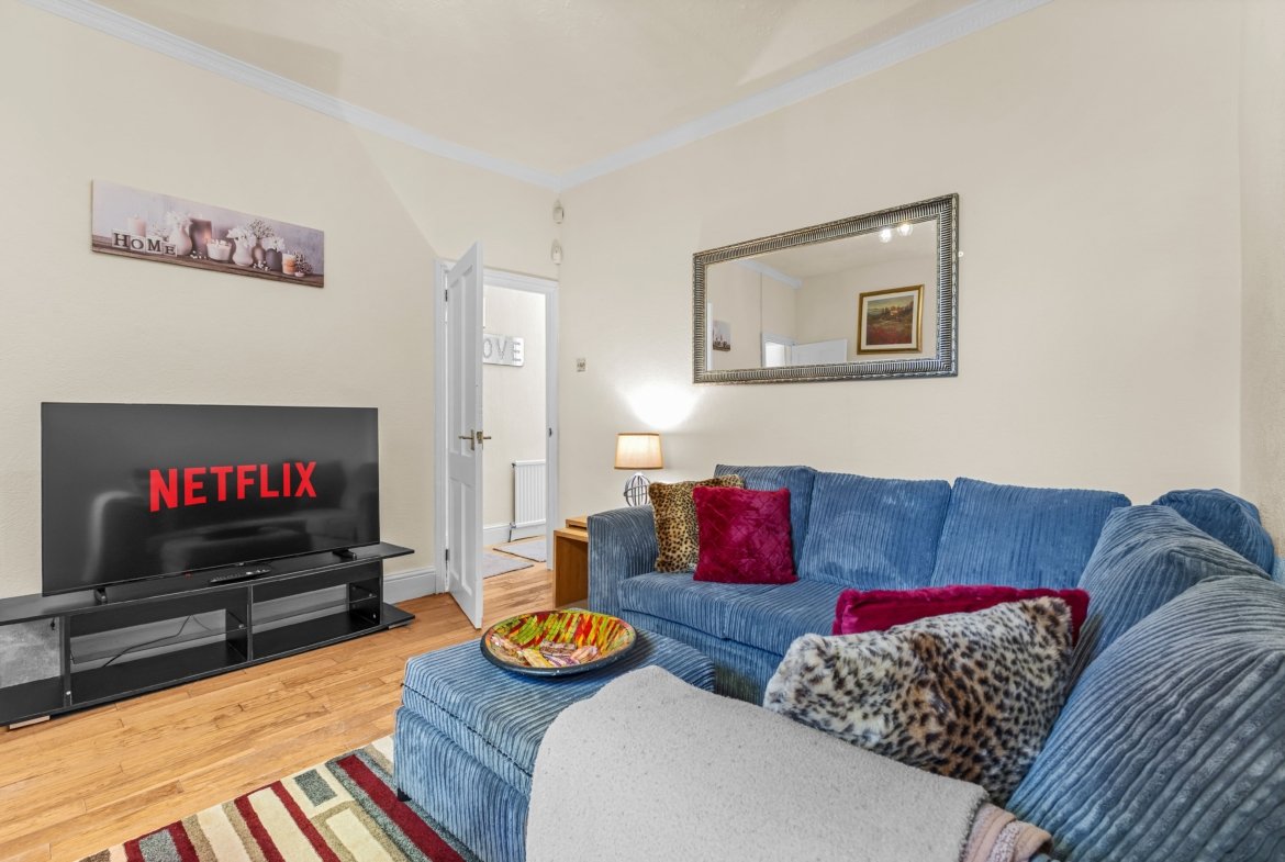 💻 Entertainment: A bright, comfortable living room with ample seating and a Smart TV.