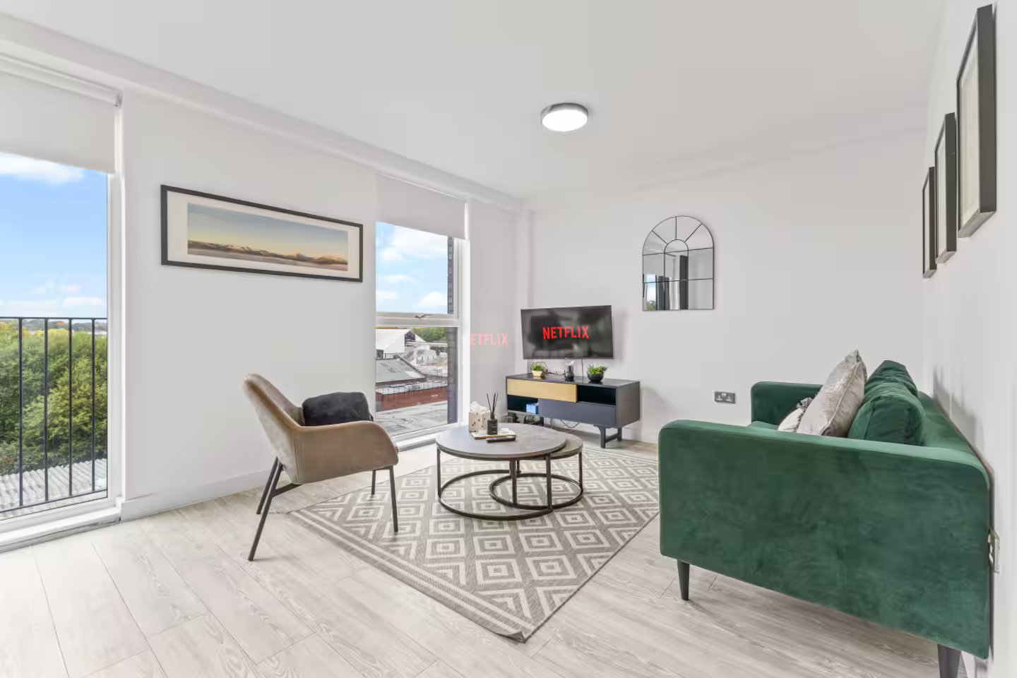 🛋️ Living Space: Bright, open-plan area with a comfy sofa and a Smart TV for your downtime.