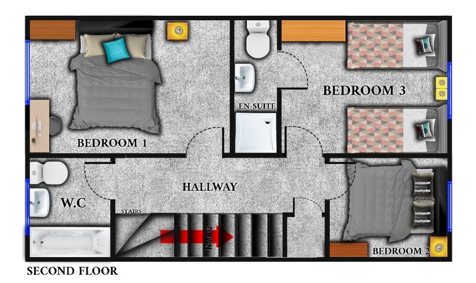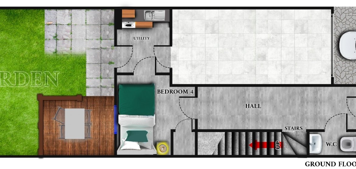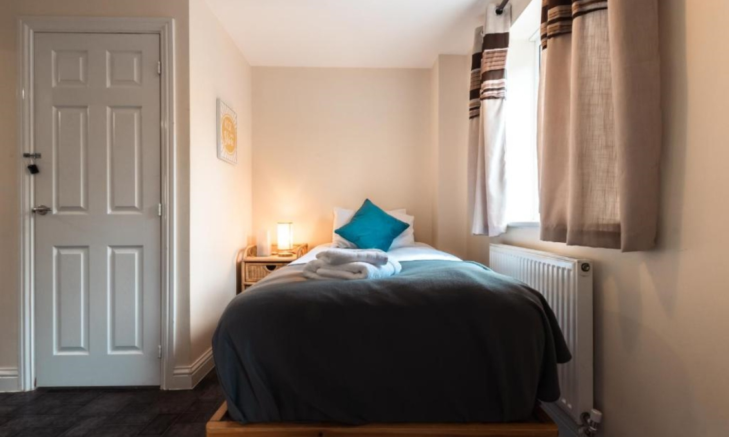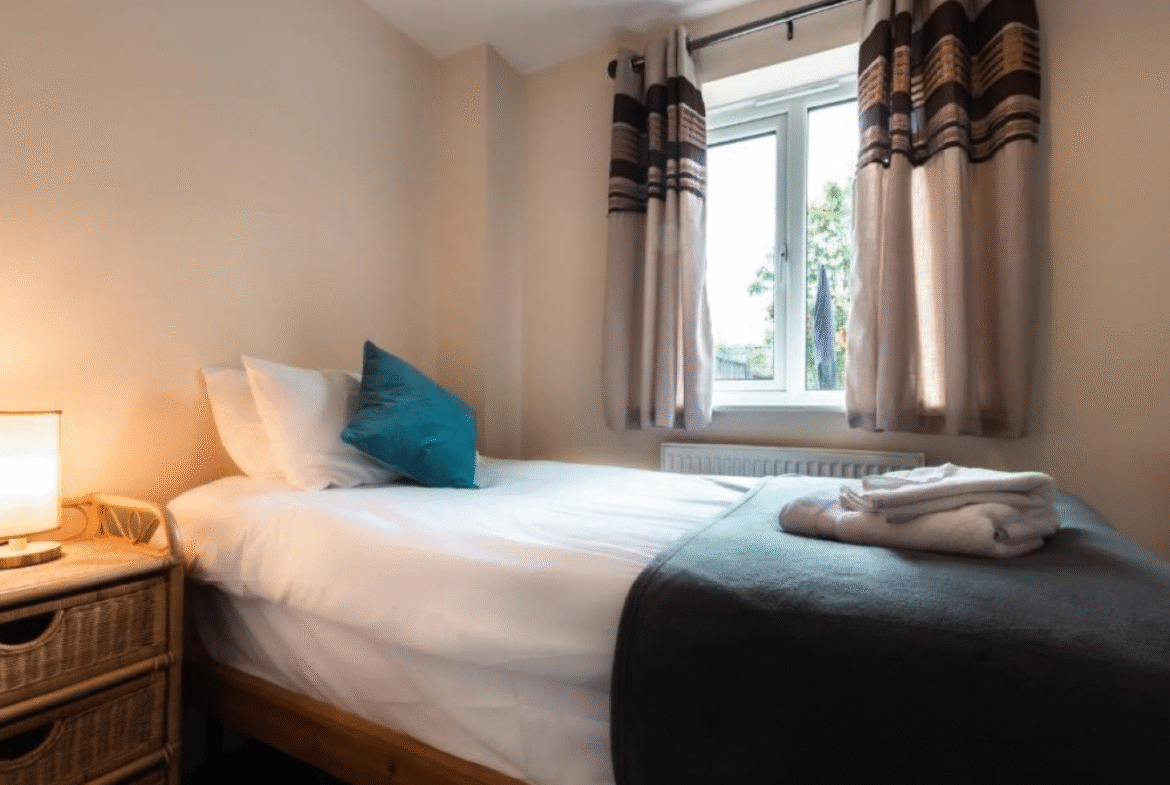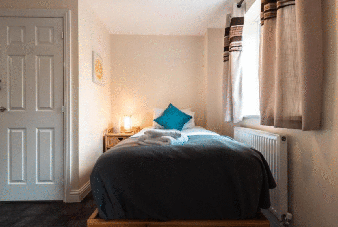 1 single bed in the 3rd room (1 guest). This room is on the ground floor and has open access to the utility and back garden area. Suited more to persons requiring no stairs for sleeping arrangements.