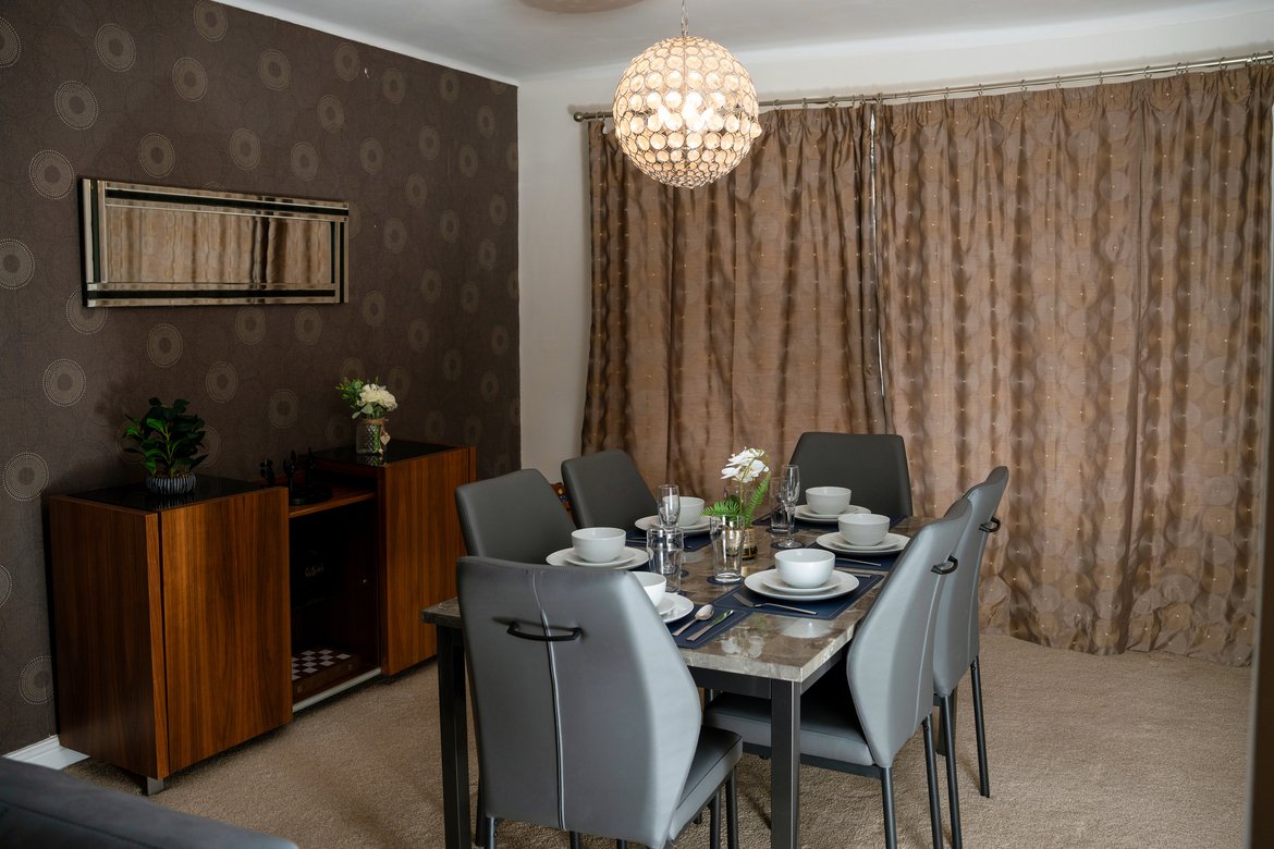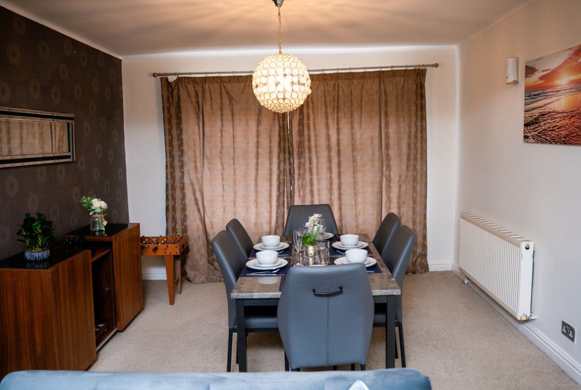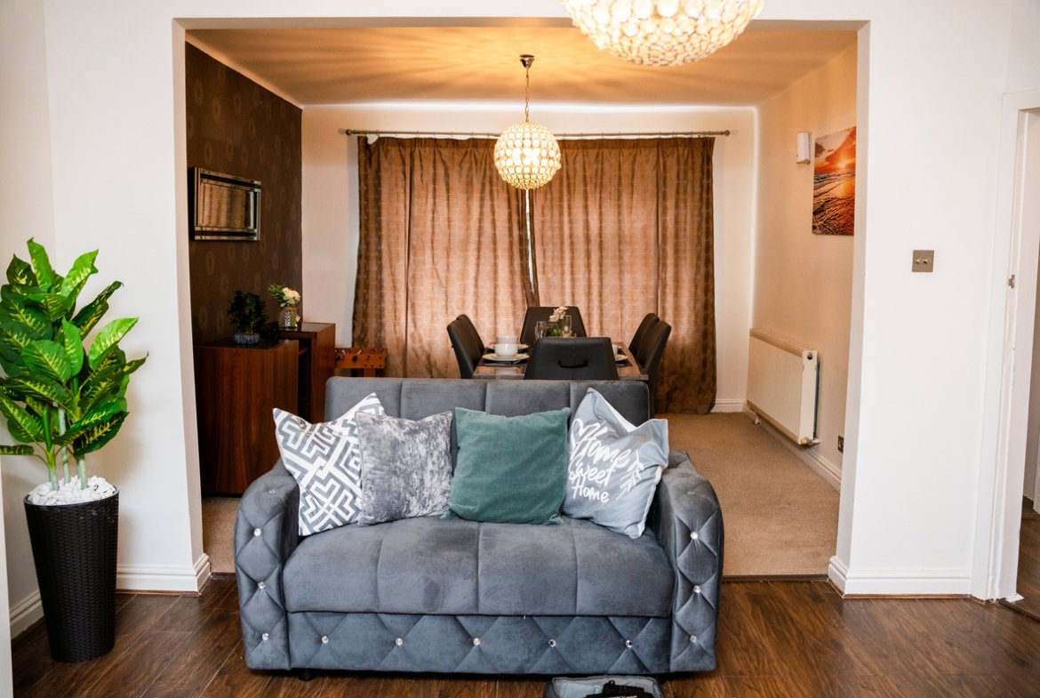 The house features generously sized bedrooms, a spacious living area, a fully equipped kitchen, and a stylish dining space, perfect for home-cooked meals and family gatherings. With 5 beds and 2 sofa bed, it can comfortably accommodate up to 10 guests, making it ideal for families, groups, or friends. Whether you’re staying for work or leisure, you’ll enjoy a peaceful residential setting with all the essentials for a comfortable short or long stay.