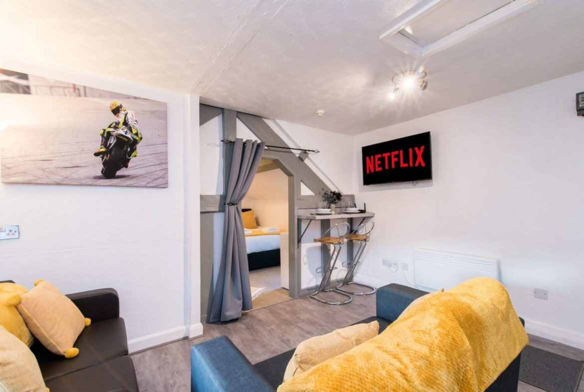 A classic studio apartment in the busy airport town of Castle Donington, offering great transport links to Leicester, Derby and Nottingham and close to the M1. The apartment boasts a bedroom/living area, separate kitchen and shower room. There is gated, free parking onsite for one vehicle and a smart TV for Netflix and Amazon.