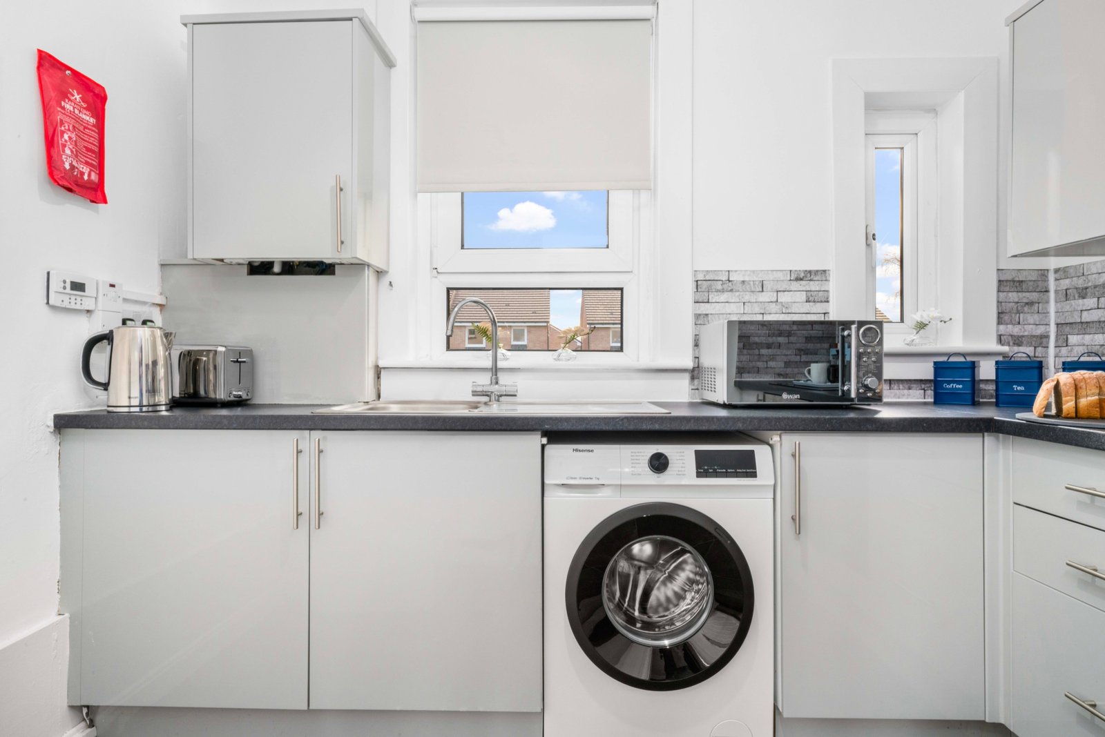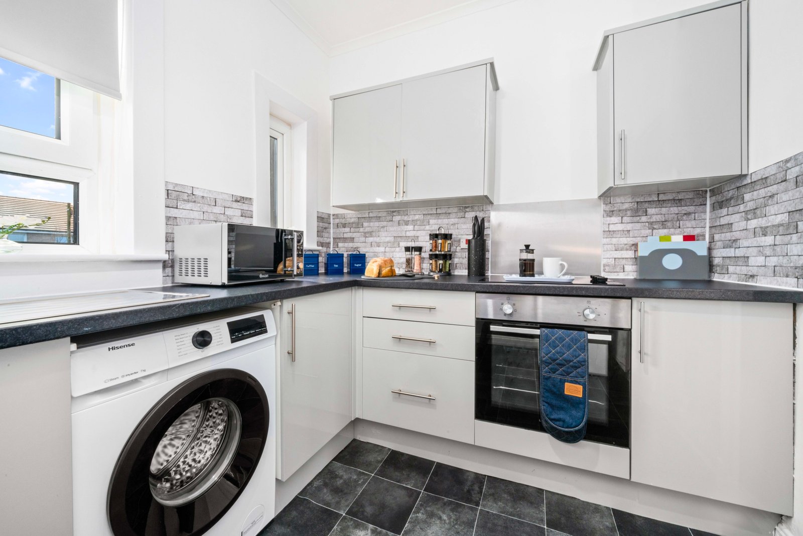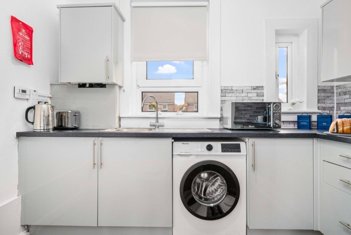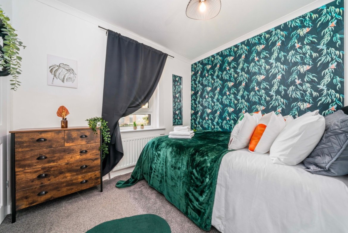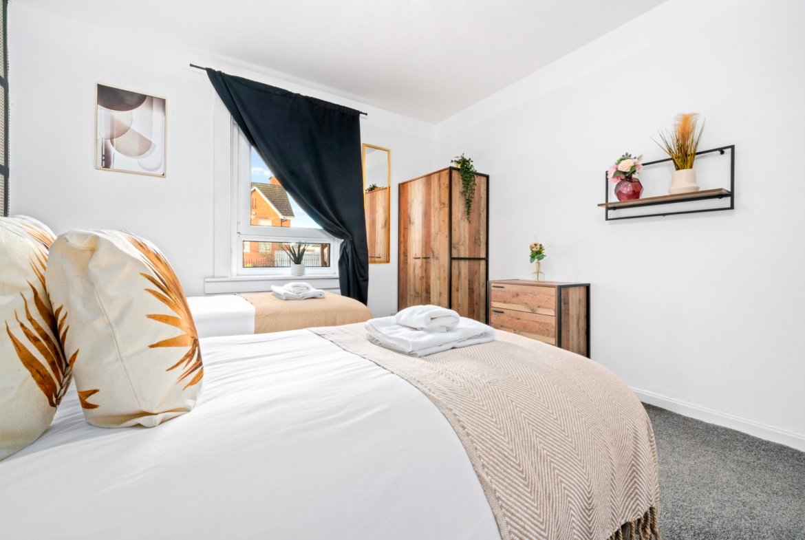 Modern ground floor 2 bedroom apartment located in Uddingston with free on street parking. Two spacious bedrooms offer zip link super king bed in 1 bedroom and king size bed in other bedroom ideal for contractors and children. The Living room offers comfy sofa bed where extra 2 guests can sleep, smart TV with Netflix and dining table. Spacious kitchen offers fridge freezer, microwave, oven with hob and washing machine. Modern wet room offers shower and complimentary toiletries. All the bed linen and towels are included as well.
